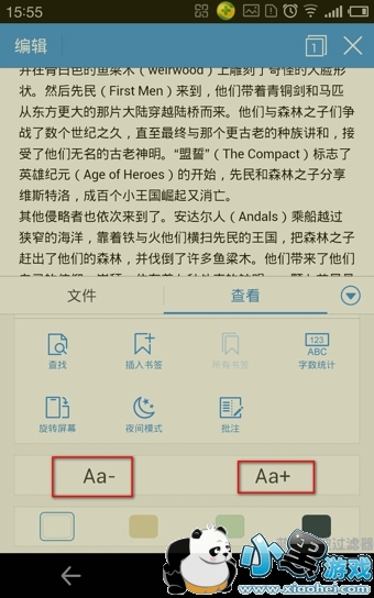 在查看的下面就有字体大小设置,Aa+、Aa-分别是增大字体和缩小字体
