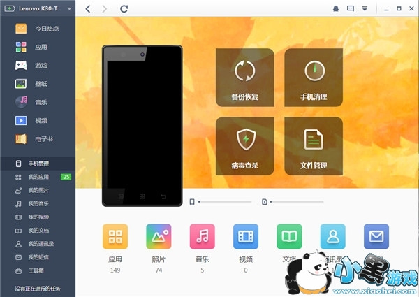 7.点击【手机管理】,进入手机管理主页面,上面显示了手机目前的状态,包括“有多少个应用程序、多少张照片、多少个音乐、视频等等”,还能够快速的进行“恢复备份、手机清理、病毒查杀”等。
