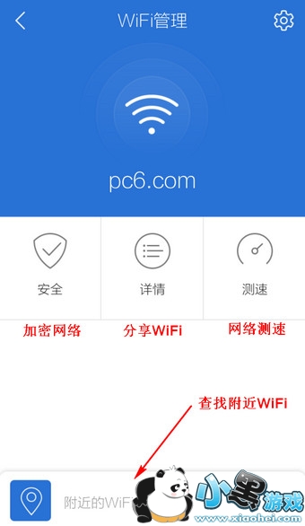 3.进入WiFi管理后,可在页面进行连接免费WiFi、加密网络、分享WiFi以及网络测速等操作