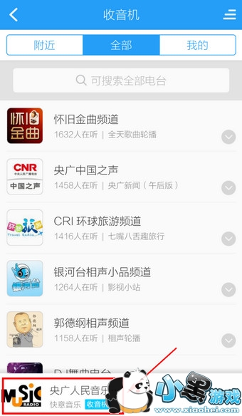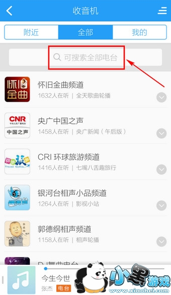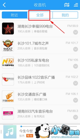 2.进入电台默认是显示【附近】,如果要搜索的话,点击【全部】