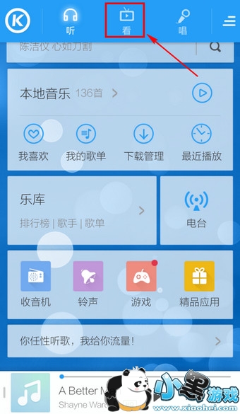 1.打开手机酷狗音乐,选择顶部的【看】
