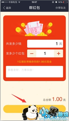 输入红包金额,点击"塞进红包"(小编幸幸苦苦攒了几个月的一块钱就这么发出去了,唉说多了都是泪,明天去公司找陈总报销去!!!)