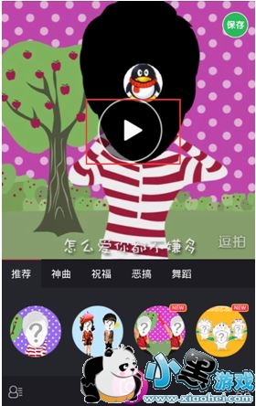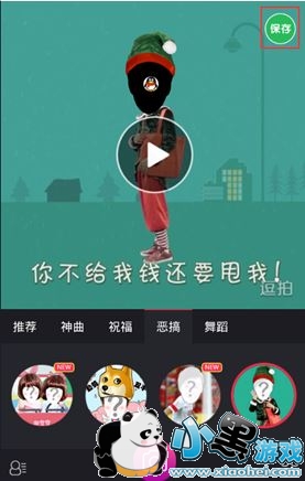 通过【推荐】、【神曲】、【祝福】、【恶搞】、【舞蹈】等多个素材的选取,制作别样视频。之后,便是【保存】了:
