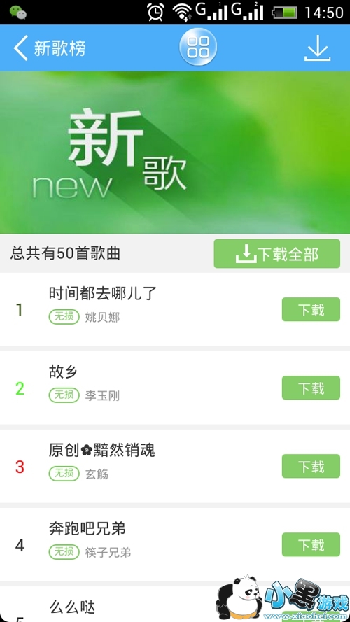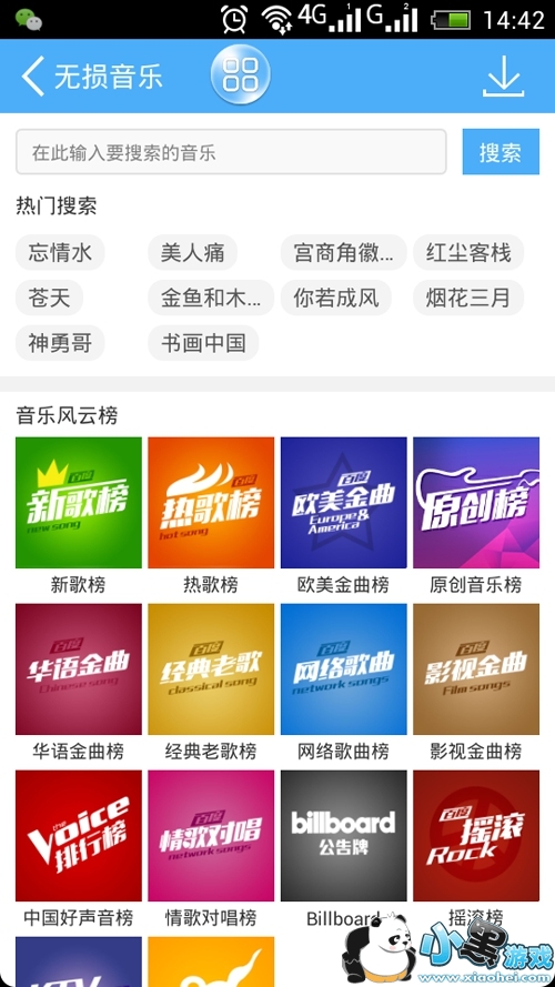 1.2、音乐风云榜按照九宫格的格式分类,独特分类格式,鲜艳的色彩让分类更为抢眼鲜明,分类内容新歌榜、热歌榜、原创音乐榜等让用户可根据自己爱好试听下载。进入所选择的音乐模块下点击歌曲可直接播放音乐,下载全部按钮下载所在模块的所有歌曲;