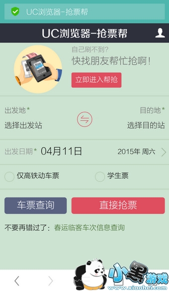 今明两天是我国农历的小年,还有多少小伙伴们还没回家,还没抢到回家的票?或者说,还没抢到返程的票?如果你真的是其中的情况,那么不妨试试手机UC浏览器中的抢票帮!