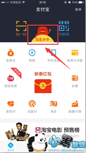 进入支付宝钱包首页,点击“红包口令”