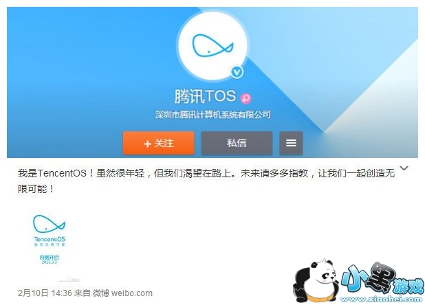 腾讯TOS官方微博于2月10日注册开通,并已经加V认证,账号信息显示为“深圳市腾讯计算机系统有限公司”。