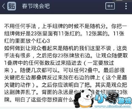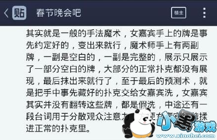 然而,纸牌魔术虽然表演的天衣无缝,但是魔术节目结束后,仍有网友进行揭秘。据“春节晚会”贴吧网友爆料,此魔术就是一般的手法魔术,女嘉宾手上的牌是事先约定好的,变出来就行,魔术师手上有两副牌,一副是空白的,一副是完整的,只是展示了一部分空白的牌,大部分正常的扑克都没有展现,最后抹出来就行了,至于最后的预测术,就是把手中事先藏好的扑克交给女嘉宾洗,女嘉宾其实并没有反转这些牌,都是假洗,中途还有一段台词用于分散观众注意力,方便女嘉宾把牌揉到正常的扑克里。
