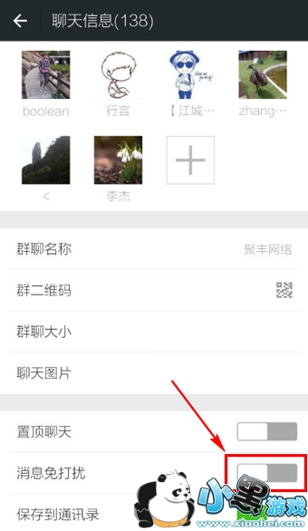 4.按钮变为绿色,表示开启消息免打扰,即屏蔽群聊