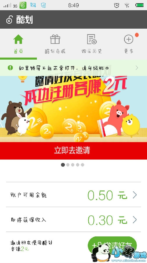 3、我们就可以看到你进入酷划的余额,注册的时候会送5毛钱然后大家关闭屏幕,在打开屏幕就可以赚钱了
