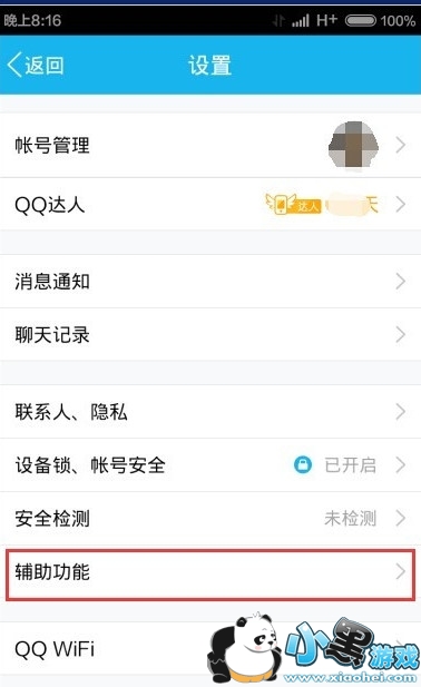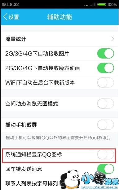 3、在“辅助功能”设置中,其中有一项是“系统通知栏显示QQ图标”,我们将使能开关关闭,这样在手机通知栏就不在显示QQ图标了