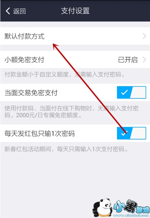 4、在“支付设置”界面,选择“默认付款方式”。