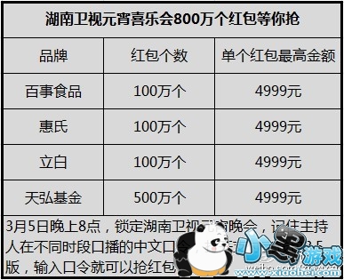 湖南卫视今年联合了天弘基金、百事食品、惠氏营养品、立白四大品牌商,将在元宵晚会过程中向观众派发800万个支付宝红包。