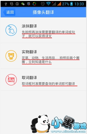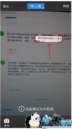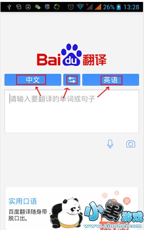 1、首先我们下载安装百度翻译app到手机,下载安装之后打开软件。打开之后我们看到有文本框输入你想要翻译的语句。也可以直接点击文本框下方右边部分的语音标志直接说出你想要翻译的句子。这就是最基础的操作 2、然后我们再来看看如何转换语种,比如“英译汉”转换成“汉译英”。这里我们直接点击上方蓝色部分“中文”和"英文"之间的转换标志。也可以直接点击中文选择翻以前的语种,点击右边的英文选择翻译后的语种。 3、然后我在来看看更加强大的功能,“摄像头翻译”。摄像头翻译在图1中标记的语音图标右侧的“相机’图标。我们直接点击进入,进入之后我们看到有三个摄像头翻译的项目,我们一一来解释一下。 4、首先看看”涂抹翻译“涂抹翻译是指用摄像头对准要翻译的文字,拍摄下来然后用手涂抹出需要翻译的区域。我这里就用现在的经验中的文字来演示吧,比如我现在想翻译”我们直接点击进入“这句话,现在我们打开涂抹翻译然后摄像头对准电脑频幕。对焦之后拍摄下来,然后用手把”我们直接点击进入“这几个字涂抹然后点翻译就可以看见翻译后的内容,还可以直接点击喇叭播放语音哦。 5、然后我们再来看一看下一个”实物翻译“意思就是拍摄一个物体然后系统会识别你拍摄的物品是什么,然后根据它识别出来的名字来翻译。我这里就拍摄个我现在喝的水杯。拍摄好了之后圈出水杯,点击翻译就可以看到翻译结果了。 6、再来最后一个摄像头翻译,”取词翻译“意思是用摄像头对准你想要翻译的词语,不用点击什么自动翻译,当你的摄像头对准另外的词语它直接翻译另外的。我这里就演示一下吧,随便扫描一个薯片袋上面的汉子”非“。 7、摄像头翻译的内容就讲完了,我们再看看会话翻译吧,进入百度翻译的主页之后点击下半部分的”会话翻译“进入。这里都是语音操作,比如我现在想和美国人对话给他打个招呼但不知道怎么说。直接打开软件点击”请说中文“我想说:”美女你好,我叫先生“。之后等待一下就可以看见翻译之后的英文了,而且会自动语音播放出来 8、最后再来学习最简单的文字翻译功能,直接在最开始的文本框输入想要翻译的文字”我是宇宙无敌大帅哥“输入这句话之后我们点击”翻译“就可以看见翻译后的英文了,点击喇叭也可以播放英文 更多 0