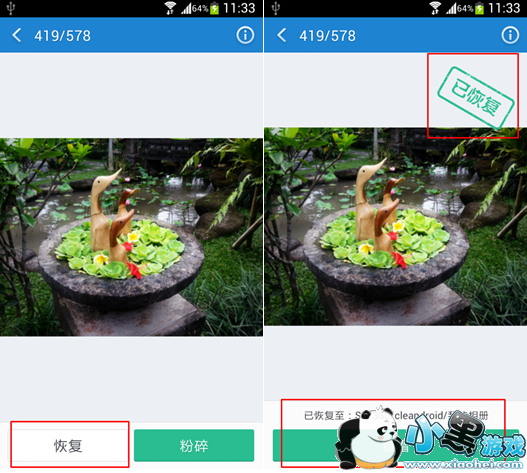 3.先是通过缩略图预览已删除照片列表,然后点击某个照片再点击“恢复”,已删除的照片瞬间恢复成功,不敢想象这是真的,太惊喜了!