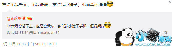 不出意外的话这款“小锤子”应该主打入门市场,定位千元左右,和魅蓝、红米等对手竞争。相比后两者,小锤子配置方面应该突破不大,其优势在于设计和系统体验。袁炫华表示重点不是千元、不是低端,重点是小锤子、小而美的锤锤。不知道会是什么样,大家敬请期待吧!