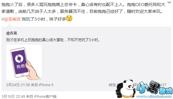抱抱这个软件完全是段子手炒火的,现在段子手貌似也成意见领袖了,不过有钱请段子手发微博,还不如好好开发软件啊亲。有人反映抱抱有时候会卡,除了软件自身还有待提升性能的原因,另一方面也是因为玩的人有点多,有点扛不住了。这也是没办法的事,所以教大家抱抱APP很卡的解决办法。