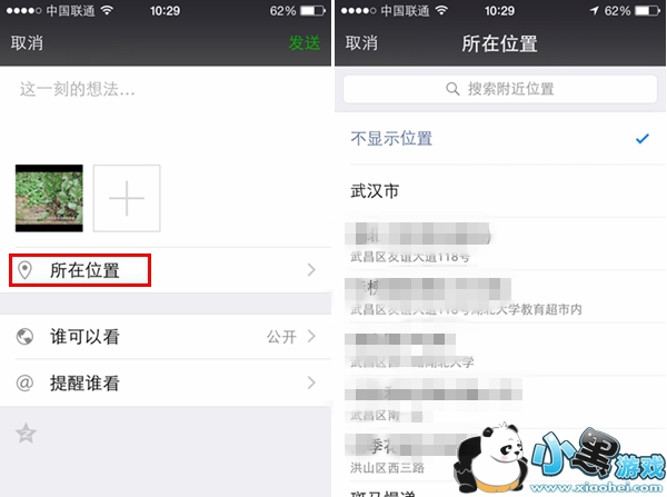 1,进入微信朋友圈后点击右上角的相机按钮,选择一张图片,随后编辑文字,之后在其下方界面找到【所在位置】点击进入到所在位置界面