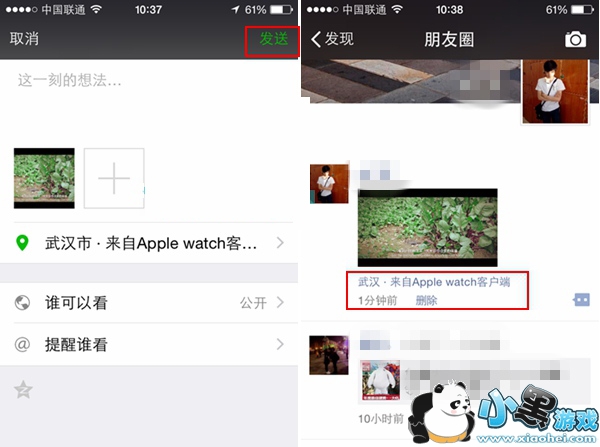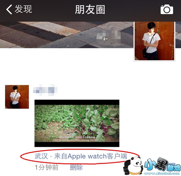 3,最近设置成功之后,我们就可以点击“发送”了,就这样动态相信成功发送,随后我们再次来到微信朋友圈动态页面去查看一下自己刚才设置效果怎么样,是否能看到“来着Apple watch客户端”字样,当然了具体的什么版本也可以随意更改