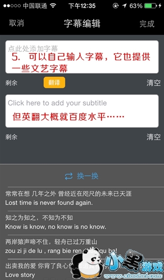 5.可以自已输入字幕,它也提供一些文艺字幕,但英翻大概就是百度水平哦。足记怎么添加英文呢?很简单,首先输入中文,然后点翻译即可。