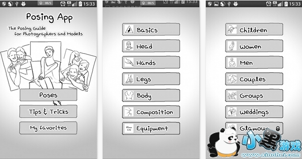 应用主要分为三部分:Poses 姿势库、技巧与贴士、我的收藏。姿势库中可以选择被拍摄主题,例如男人、女人、小孩子的独立写真,或者家庭照、婚礼照、社交照片等;技巧与贴士里面我们可以学习到拍照中身体不同部位的摆放技巧、拍照背景和地点的选择等。虽然是全英文界面,不过单词大多数是英语四级的水平,当做离线阅读内容也没有太多难度。