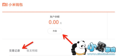 4.登录之后,您可以看到您的余额以及交易记录,点击“充值”按钮可以对小米钱包进行充值操作。