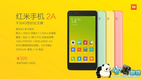 红米2A(移动4G双卡双待手机,定价599元,性价比之王,米粉节特价499元),红米2A将会对目前的低价市场造成又一次的冲击。来看看它的配置,4.7英寸IPS屏幕,200万像素前置+800万像素后置摄像头。1.5GHz主频联芯L1860C四核处理器,1GB RAM+8GB ROM机身内存,支持TDD-LTE网络,配备2200mAh锂电池。