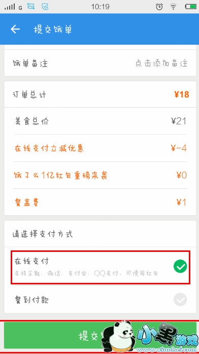 3、然后我们可以看到有一个选择支付方式的界面我们点击勾选“在线支付”,然后点击提交饿单