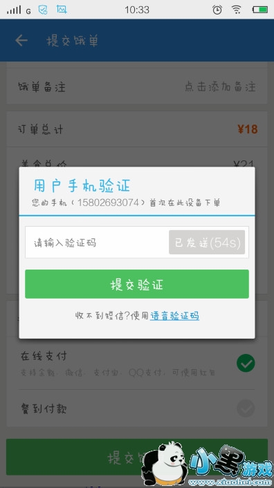 4、然后输入验证码,点击提交验证之后我们就输入你的支付密码,然后大家就可以坐等外卖了