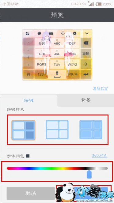 3、选择好自己想要设置为皮肤的图片,然后我们可以调整一下按键中的字体颜色和按键样式,调整一下背景选择自己想要的透明度以及背景的亮度