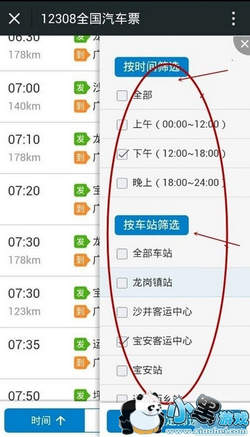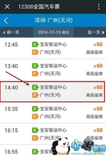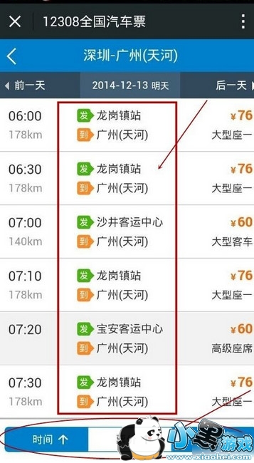 点击查询之后,弹到班次信息主页面,这里列出来了深圳到广州天河的所以班次信息。可以先根据发车时间或者票价进行排序,然后根据自己的需要筛选车站和发车时段。我想要下午两三点从宝安汽车站出发,选择好之后,确认筛选。