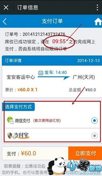 点击确认,就到付款页面,再付款页面,需要注意,必须在10分钟之内完成付款,否则订单将作废。下方有两种支付方式可以选择,一个是支付宝,一个是微信支付。我选择了微信支付,点击确认,就转到微信支付页面,输入账号密码,确认支付(此页面仅作为演示信息,实际支付应为60元票价)。