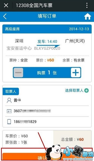 登录之后,就会弹出包含个人信息的订单确认页面,里面有班车余票信息,姓名、电话、身份证号等,如果确认无误,就点击下方的订单确认按钮。如果没有余票,则需返回重新选择。