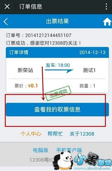 支付成功之后,系统跳转,显示出票成功,然后查看取票信息。(此步骤图片仅作为演示,实际应支付60元票价)