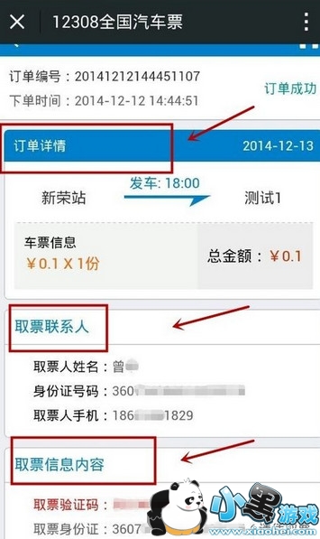 点击之后,就会跳转到取票信息页面,这里可以查看订单信息,取票信息。到时候,根据这里的信息,乘车时带上身份证到车站窗口或者自助取票机,取票,然后就可以直接上车啦。(此步骤图片仅作为演示用,实际应付60元)