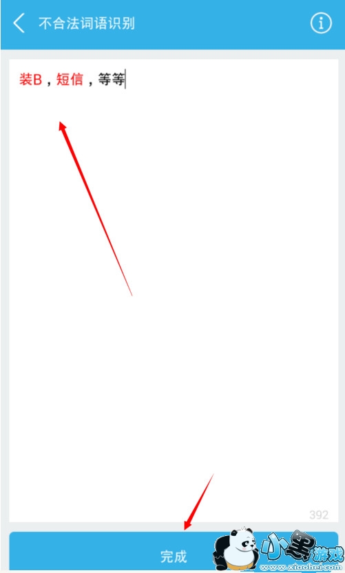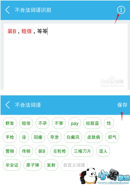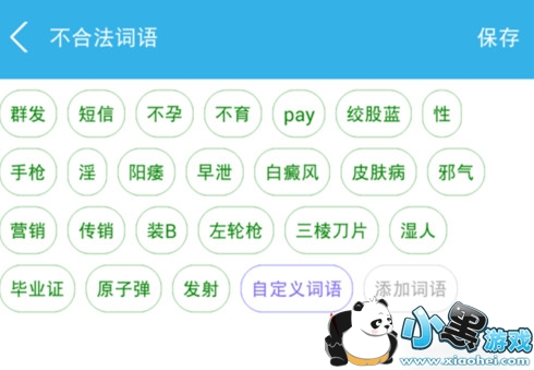 4、点击右上角的图标可以进入违规词语列表界面,您还可以自定义自己发现的违规词语,输入违规词语,点击“保存”按钮即可保存。