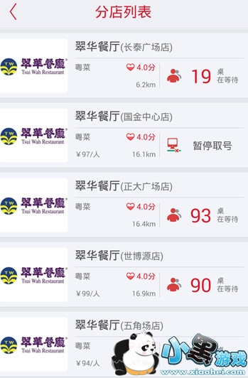 2、点击即可进入餐厅列表,同样基于定位将30公里内提供排号的餐厅,按照距离排列,界面信息包括菜系,人均价格,距离,评分,等位人数,根据自己的需求点进去。