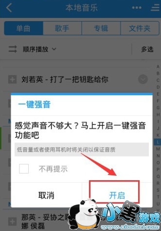 7、我们可以点击提示框的右下方的“开启”按钮来开启酷狗音乐的一键强音