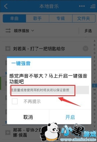 6、点击“增强”按钮向右侧滑动,出现了一个对话框,提示是否开启一键强音功能,而且提示如果用耳机时将关闭