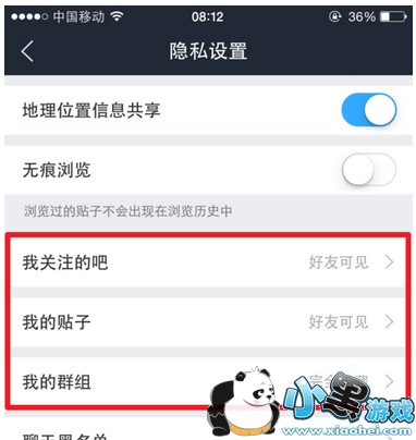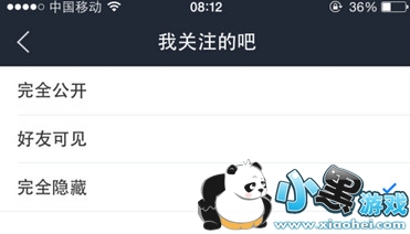 5、进入【我关注的吧】,可以将个人动态设置成完全公开、好友可见、完全隐藏,根据自己的需要进行选择