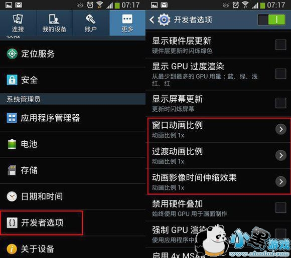 一些Android设备都内置了动画效果,实际上这也在一定程度上影响了性能。一些采用自定义界面的机型可以在显示项目中直接关闭动画效果,原生机型也可以通过进行开发者选项,关闭窗口、过渡等动画模式。