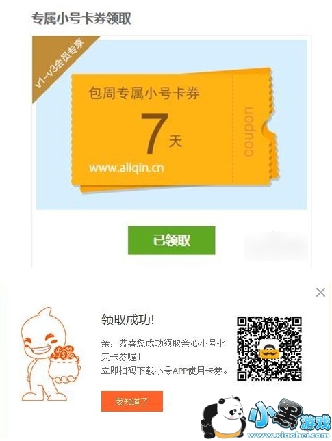 进入后你可以看到阿里手机客户端特权,下面有专属小号卡券领取,点击立即领取