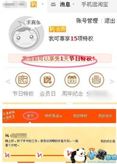 入淘宝网的首页,在左上角的用户名那儿点击下拉框出现你的头像,点击中间的特权,进入你的特权界面,再点击“首页”。