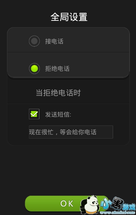 4、如果您要是拒绝电话,选择拒绝电话,我们还可以选择拒接电话,给您的朋友回复短信,设置好了之后,我们点击下边的ok即可
