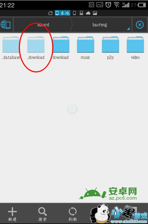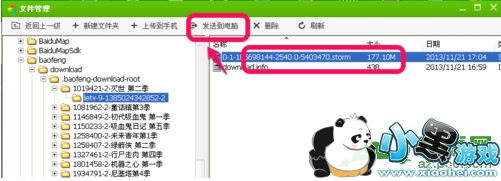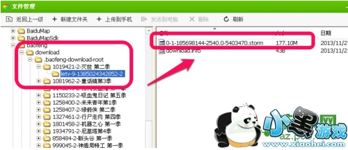 接着我们看下面的目录,最终的目录结构:存储卡/baofeng/download/.baofeng-download-root/,在这个下面就是你的缓存文件,点击进去你看到一个xxxx.storm的文件,看大小就知道是你缓存的电影了