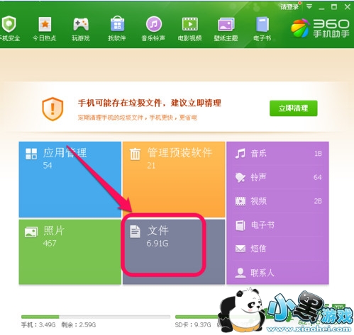 然后我们通过360手机助手讲手机连接电脑,在电脑上打开360手机助手,点击文件