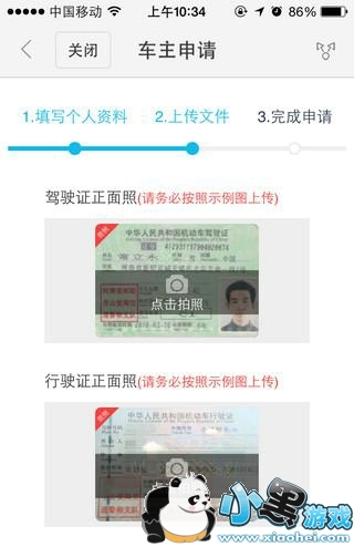 第三步:填写相关的车主信息,把驾驶证与行驶证的照片上传,如果这两个证没带在身上也不着急,可以事后补上。上传完后点击提交。