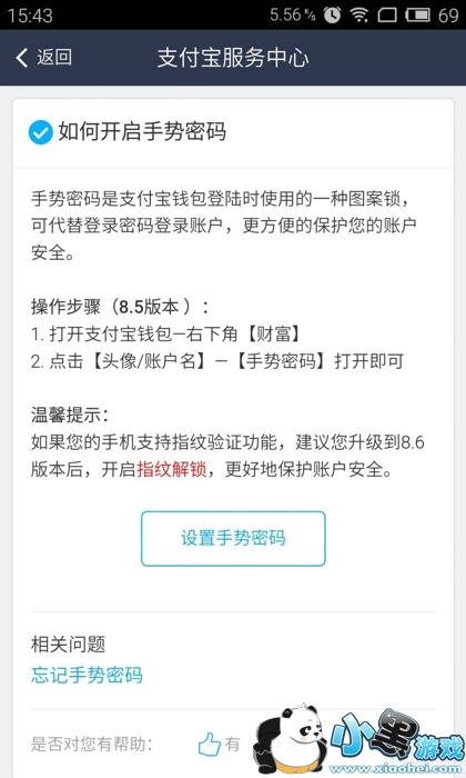 打开支付宝钱包从「服务窗」里找到「支付宝客户中心」在左下角「遇到问题」中选择「服务大厅」打开后输入「如何开启手势密码」