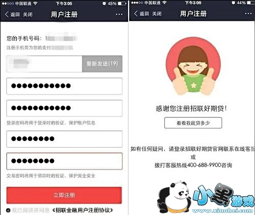 第四步:接着就到了招联好期贷开通界面,需要获取短信验证码,创新密码以及支付密码,这些密码需要字母和拼音组合,完成后点击底部的“立即注册”。之后会看到“感谢您注册招联好期贷!”提示。如果需要开通招联好期贷,请点击下面的“看看我能贷多少”,如图所示。