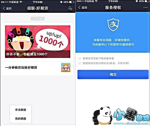 第三步:接着在打开招联好期贷界面,点击底部的【额定】,会弹出菜单然后点击“申请额度”。接下来提示的“该服务由招联贷款提供界面”点击底部的【确定】,如图所示。